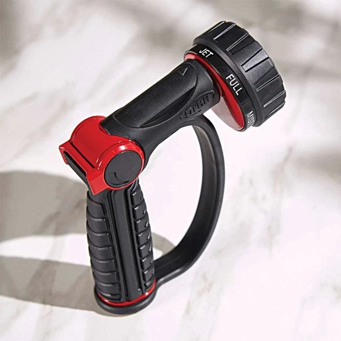 The Orbit Thumb Control D-Grip Contractor Turret Pistol nozzle offers a choice in spray patterns – find the right now for every task in the home and garden, from a gentle, rain-like shower for gardens to a powerful jet stream perfect for cleaning away debris. To modify water pressure, a thumb control knob allows a quick adjustment to the flow of water without having to walk back to the faucet.