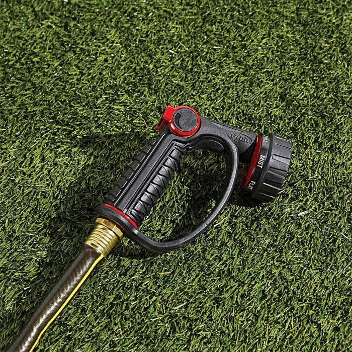 The Orbit Thumb Control D Grip Contractor Turret Pistol Nozzle features 7 spray patterns, a thumb control knob for adjusting water pressure, contractor grade construction for durability, a non-slip grip and contoured design for comfort and easy storage, a non-corrosive exterior, and a soft touch dial guard for easy selection and changing of spray patterns.